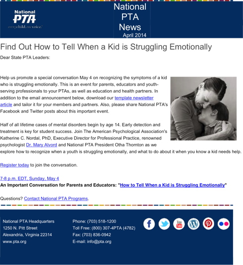 For more information, see How to Tell When a Kid is Struggling Emotionally or email programs@pta.org.